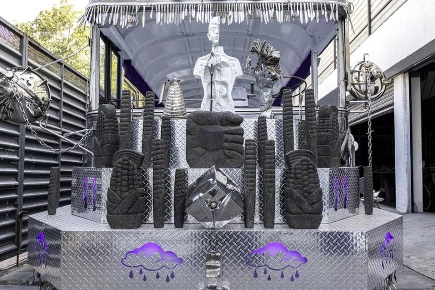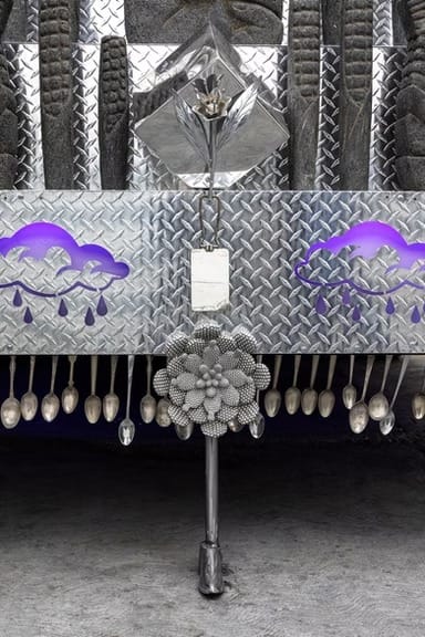 Combinando la ascendencia centroamericana precolonial, la mitología personal y los actos performativos colaborativos, las representaciones, los objetos y los dibujos de Maravilla trazan la historia de su propio desplazamiento y el de los demás. Seleccionando las enredadas genealogías ficticias y autobiográficas de los relatos de los cruces fronterizos, Maravilla nutre las narrativas colectivas de trauma en celebraciones de perseverancia y humanidad. A través de todos los medios, Maravilla explora cómo el abuso sistémico de los inmigrantes se manifiesta físicamente en el cuerpo, reflexionando sobre su propia batalla contra el cáncer, que empezó en sus entrañas. Las esculturas a gran escala de Maravilla, tituladas Lanzadores de enfermedades, funcionan como tocados, instrumentos y santuarios mediante la incorporación de materiales recolectados en sitios de América Central, modelos anatómicos e instrumentos sónicos como caracolas y gongs. Descritos por Maravilla como “máquinas de sanación”, estos Disease Throwers sirven en última instancia como símbolos de renovación, generando un sonido terapéutico y vibracional. “Ahora que he aprendido a curarme”, dijo una vez Guadalupe Maravilla, “tengo que enseñar a otros a curarse a sí mismos”. Esta preocupación por la curación y las formas de atención, moldeada por la historia personal de Maravilla, es la base de sus exploraciones de la escultura, la actuación y el ritual.
