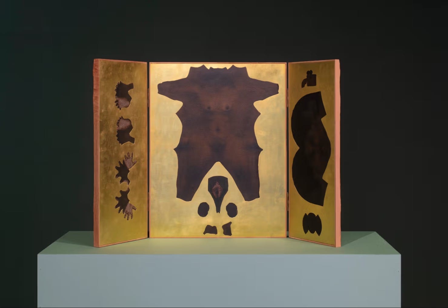 Ensamblaje en madera oro y piel. 100 x 64 x 3,5 cm
