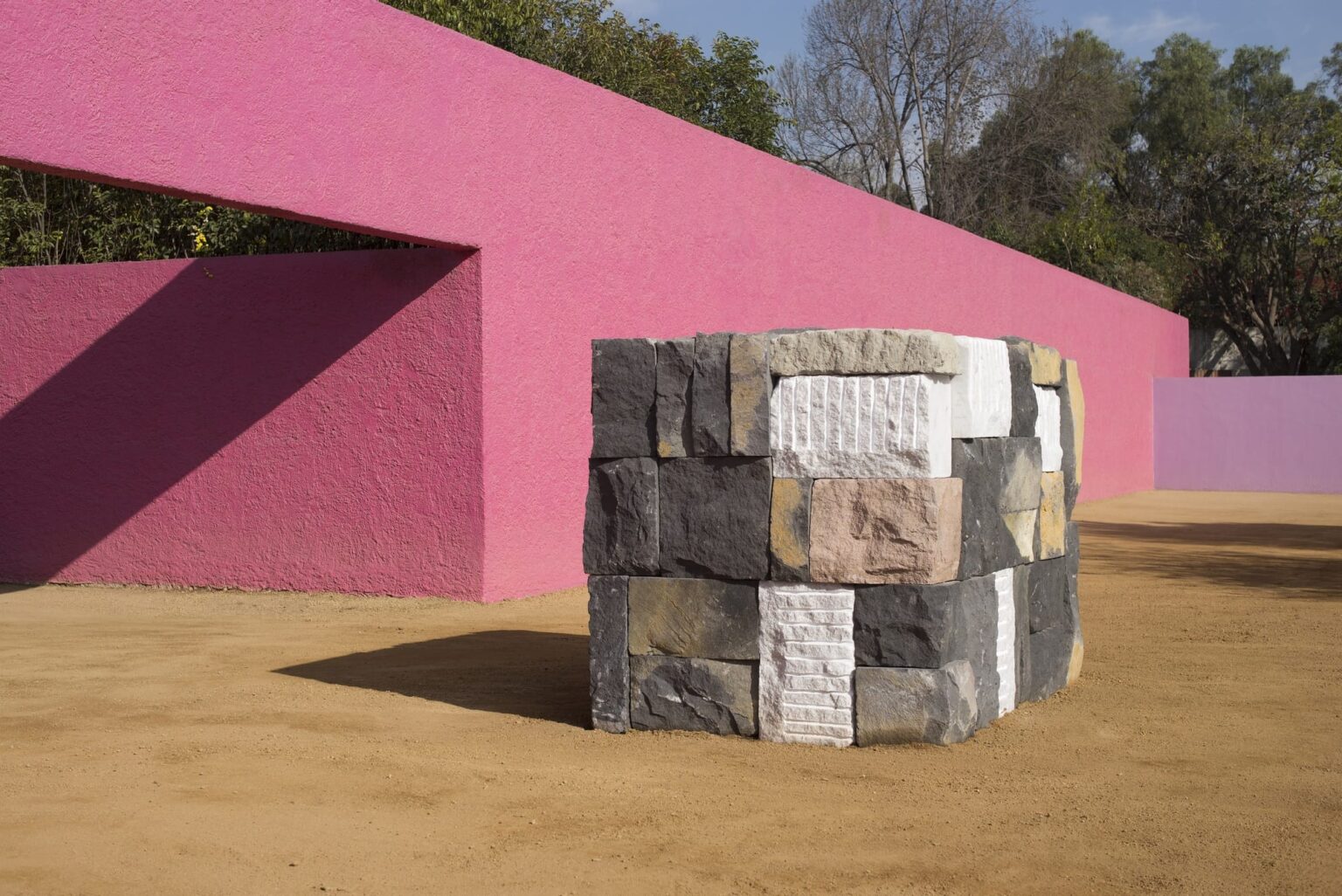 Instalación de la pieza «Wall of Light Cubed» del artista Sean Scully en la Cuadra San Cristóbal de Luis Barragán.
